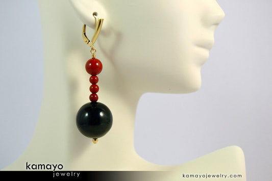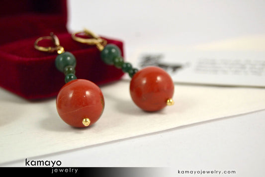 ARIES EARRINGS - Large Red Jasper Ball and Small Green Jasper Beads - Beaded Dangle Ear Rings for Women - 14K Gold Filled Leverback