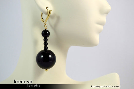 BLACK ONYX EARRINGS - Beaded Dangle Ear Rings for Women - Large Ball Pendant - 14K Gold Filled Leverback