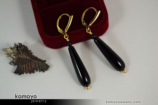 BLACK ONYX EARRINGS - Long Drop Ear Rings for Women - Teardrop Pendant - 14K Gold Filled Leverback