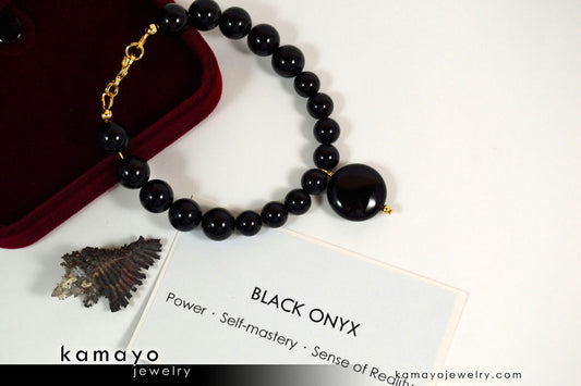 BLACK ONYX BRACELET - Coin Pendant and Round Beads