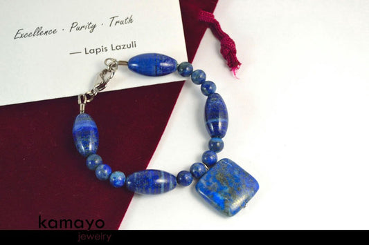 LAPIS LAZULI BRACELET - Blue Square Pendant and Large Rice Beads