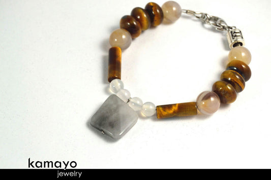 GEMINI BRACELET - Grey Agate Pendant and Tiger Eye Beads