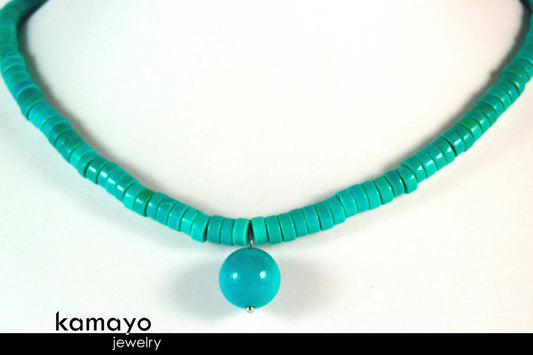 TURQUOISE NECKLACE - Womens' Beaded Choker - Round Pendant and Disc Stone Beads