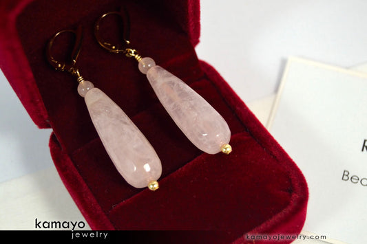 ROSE QUARTZ EARRINGS - Long Drop Ear Rings for Women - Pink Teardrop Pendant - 14K Gold Filled Leverback