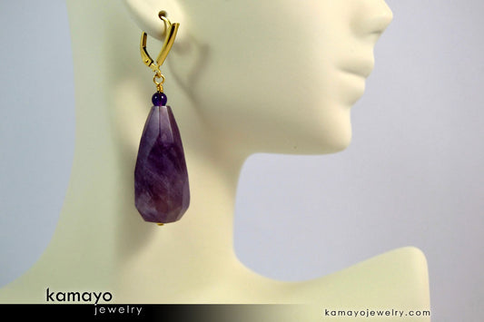 AMETHYST EARRINGS - Large Drop Ear Rings for Women - Faceted Chevron Amethyst Teardrop Pendant - 14K Gold Filled Leverback