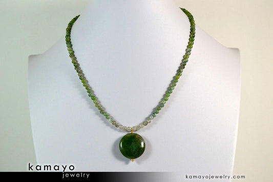 GREEN MOSS AGATE NECKLACE - Coin Pendant and Round Beads