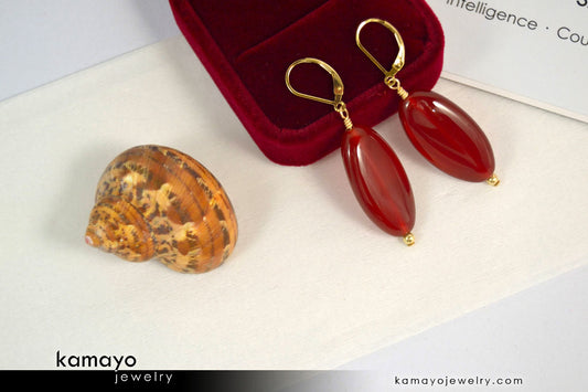 SARD EARRINGS - Long Drop Ear Rings for Women - Red Oval Pendant - 14K Gold Filled Leverback